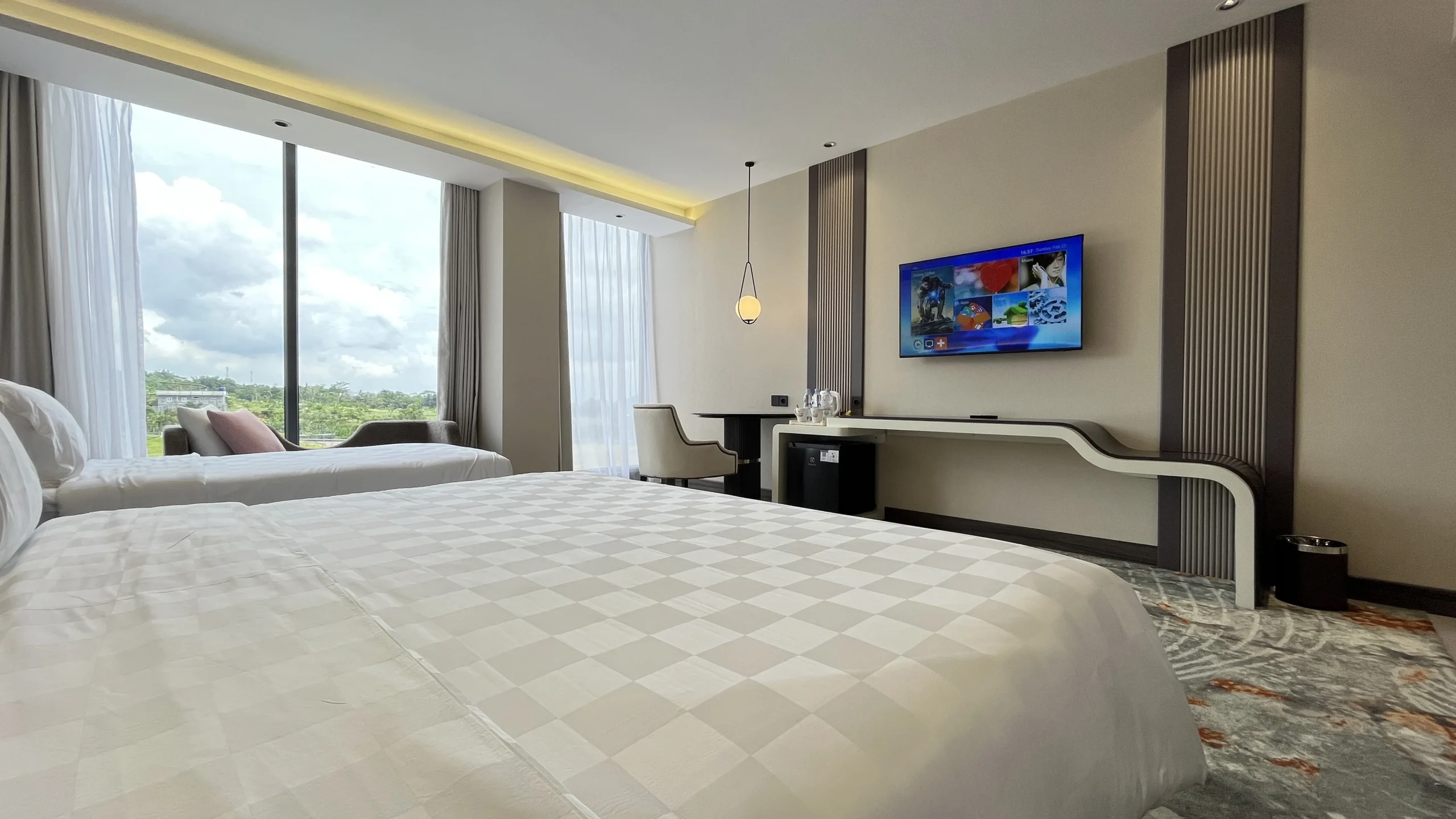 Executive Balcony adalah kamar modern dan elegan dengan ruang luas, dilengkapi Twin Bed atau King Bed, ideal untuk kenyamanan tamu bisnis maupun keluarga.